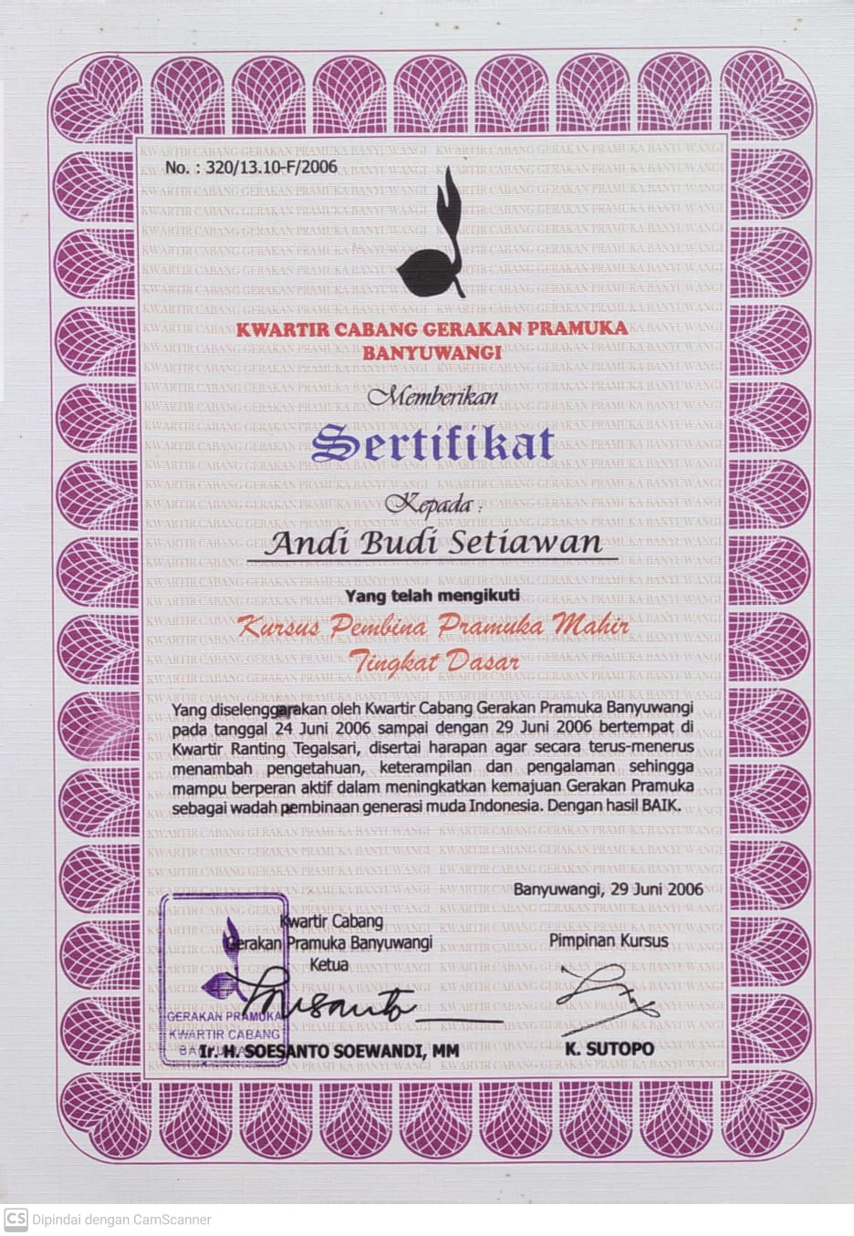 Sertifikat Kursus Pembina Pramuka Mahir Tingkat Dasar tahun 2006 oleh Kwartir Cabang Gerakan Pramuka Banyuwangi