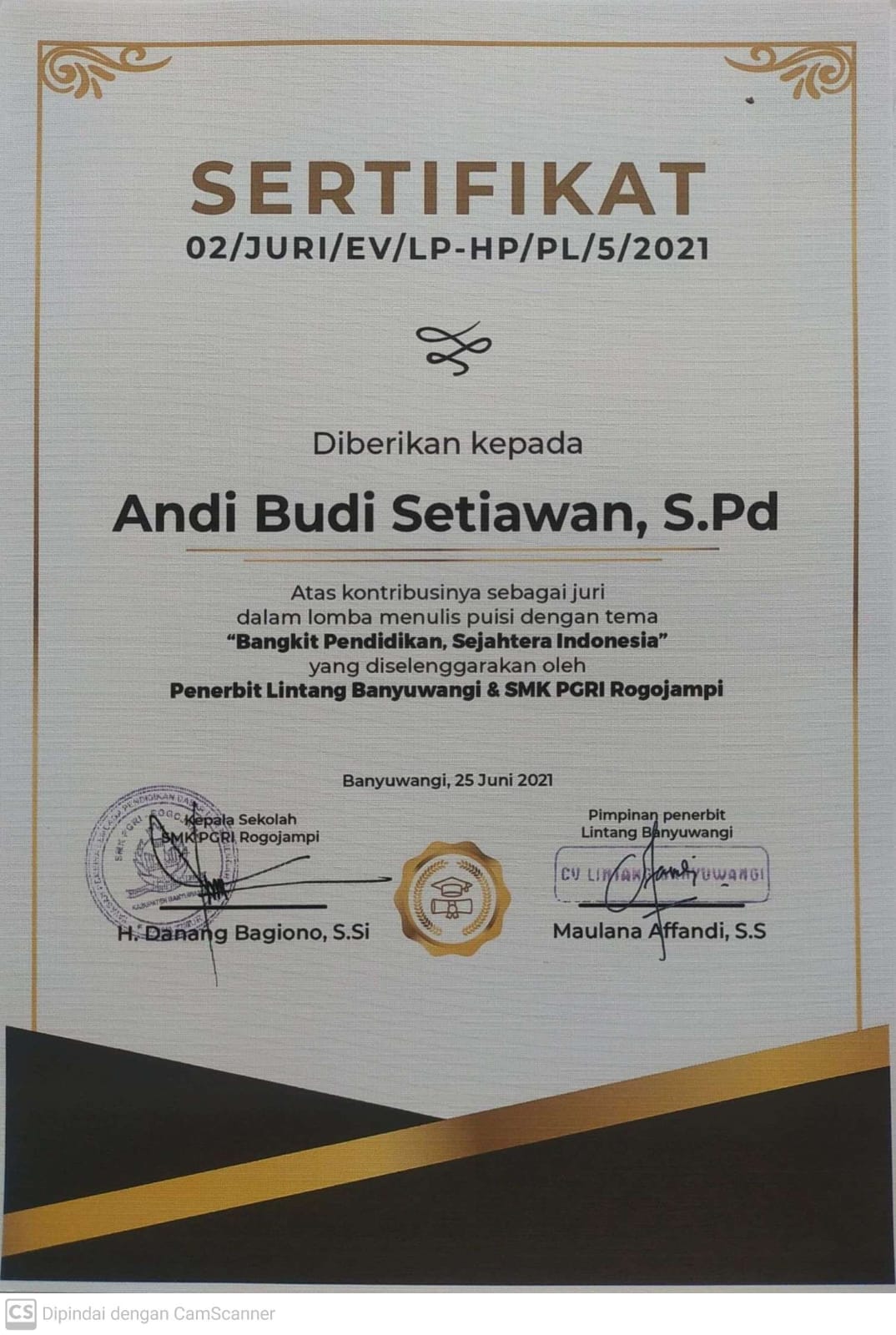 Sertifikat Juri Lomba Menulis Puisi “Bangkit Pendidikan Sejahtera Indonesia” tahun 2021 diselenggarakan oleh Penerbit Lintang Banyuwangi