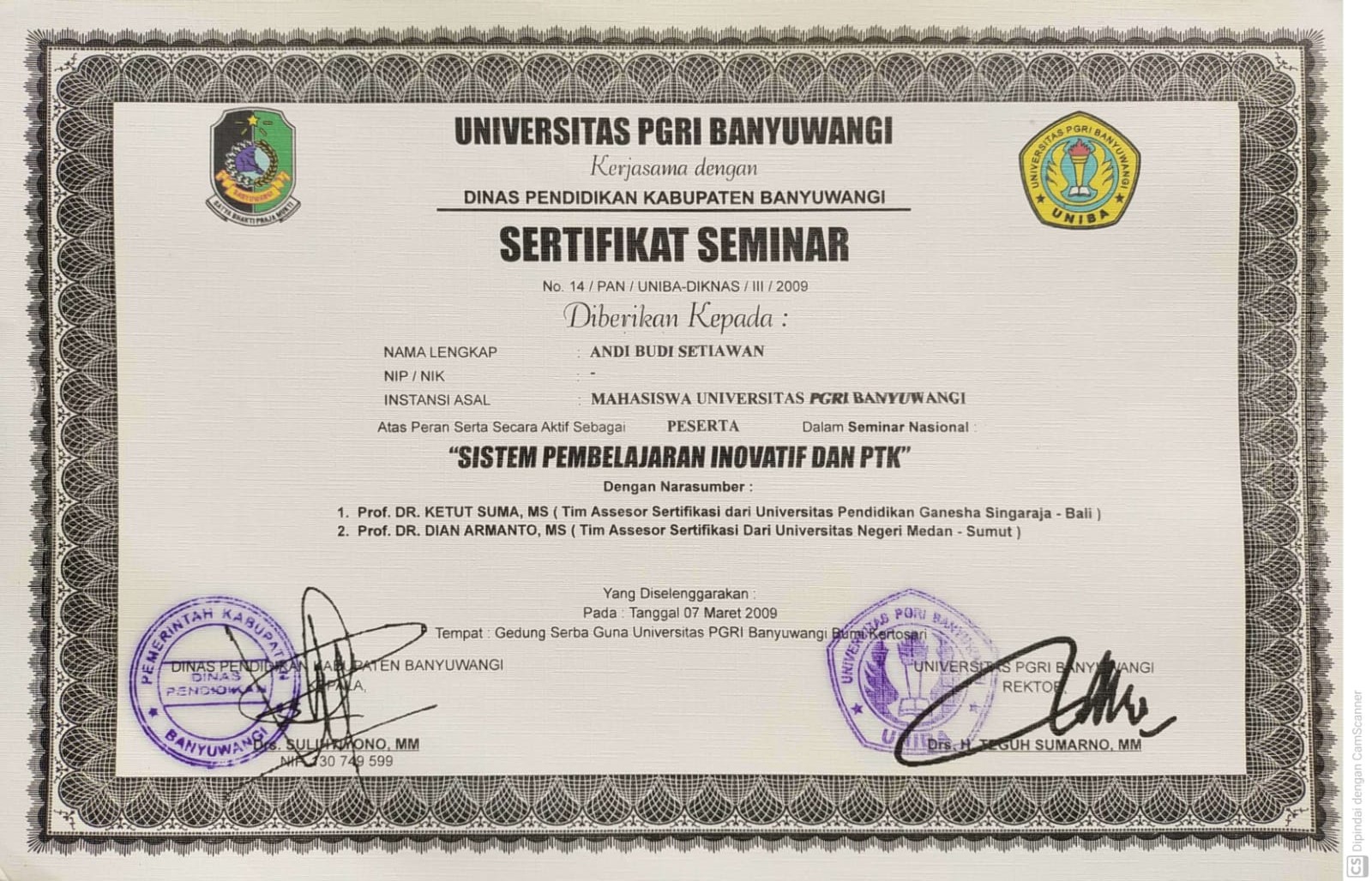 Sertifikat Pelatihan “Sistim Pembelajaran Inovatif & PTK” tahun 2009 oleh Universitas PGRI Banyuwangi