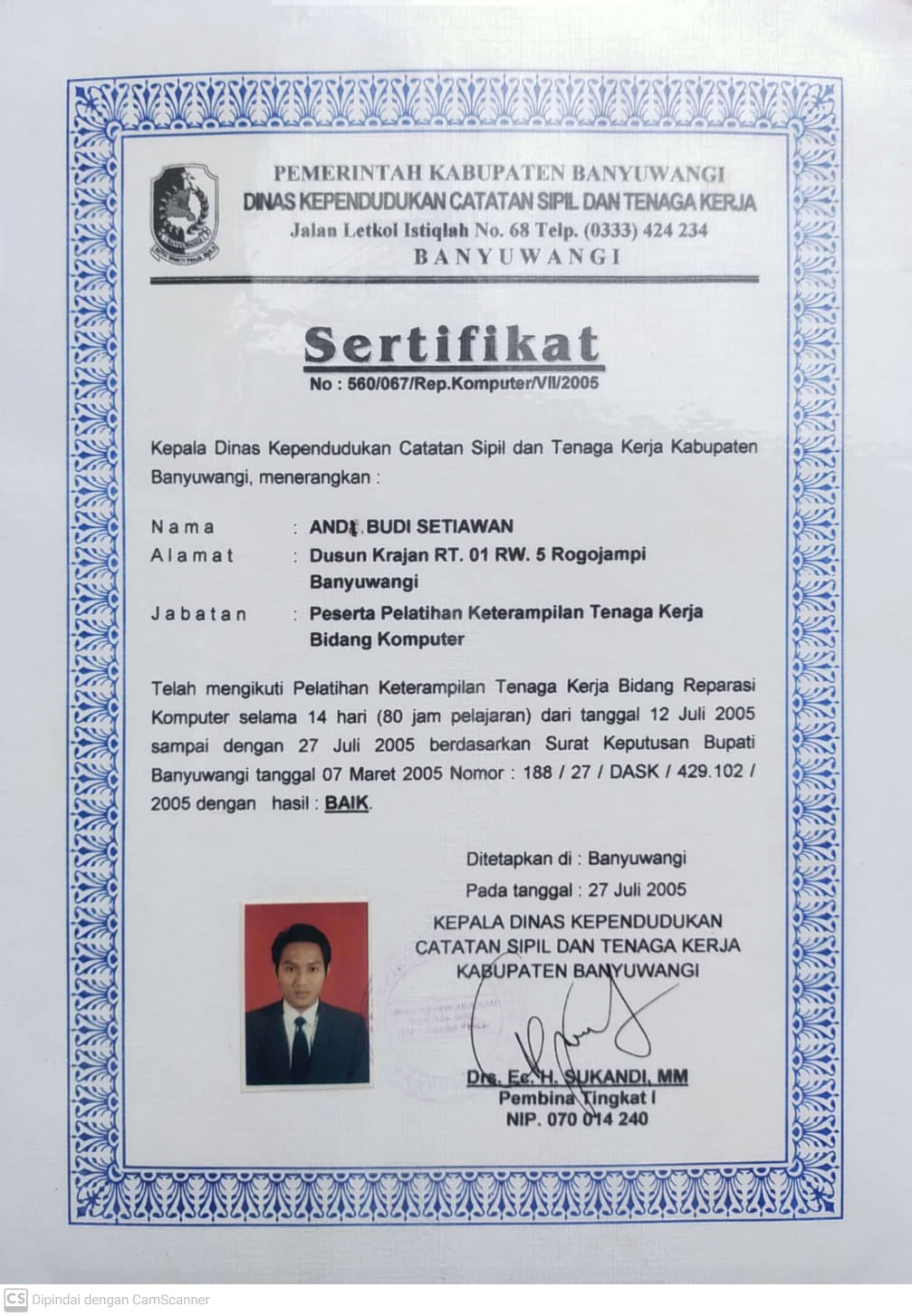Sertifikat Pelatihan Keterampilan Tenaga Kerja Bidang Komputer tahun 2005 oleh Dinas Kependudukan Catatan Sipil dan Tenaga Kerja Kabupaten Banyuwangi