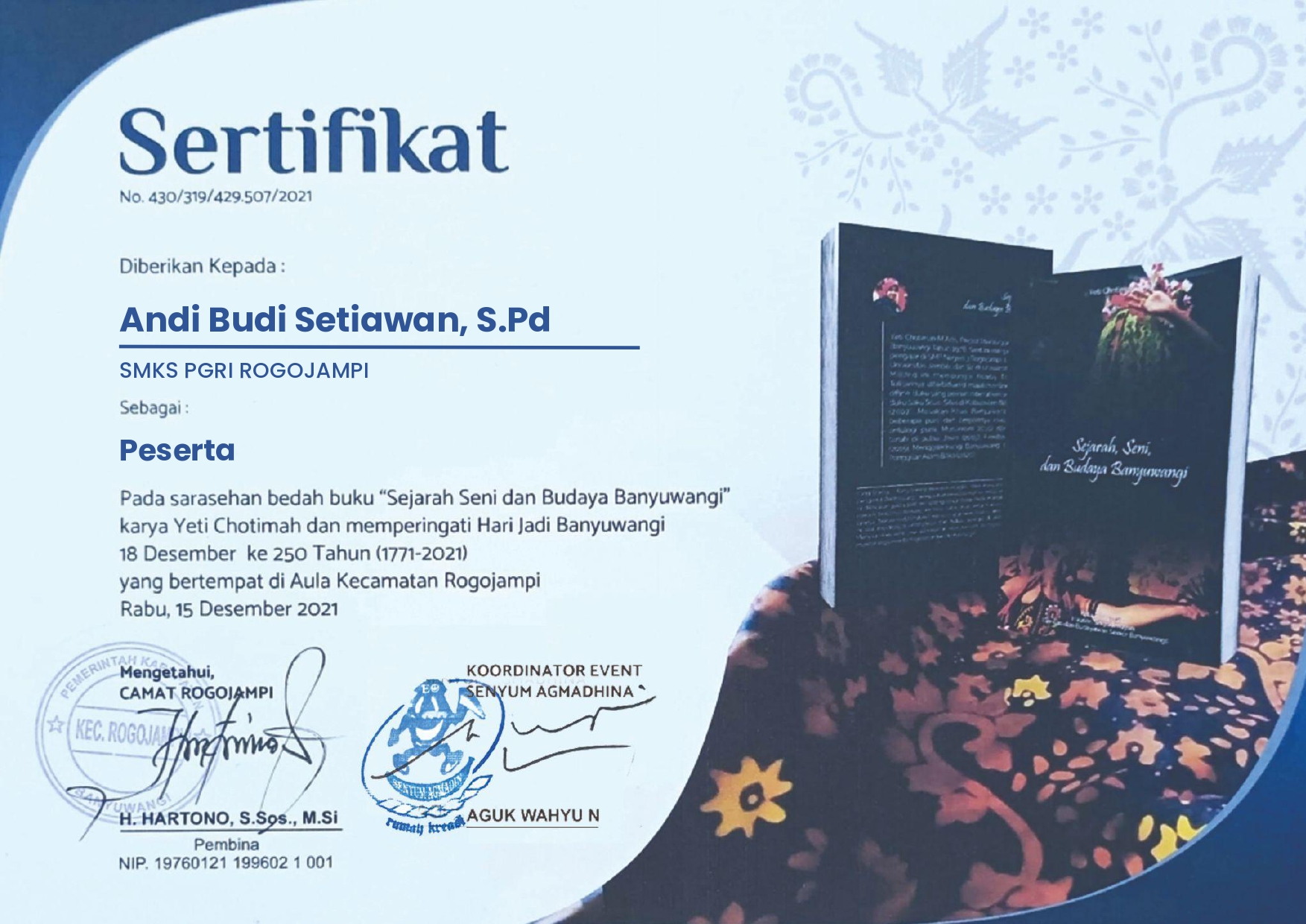 Sertifikat peserta bedah buku "Sejarah Seni dan Budaya Banyuwangi" tahun 2021 yang diselenggarakan oleh Senyum Agmadhina