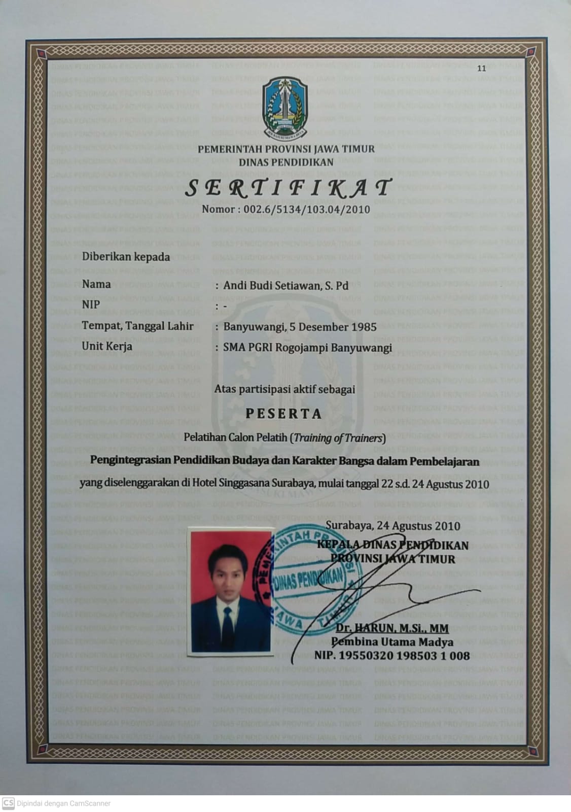 Sertifkat Peserta Training Of Trainers “Pengintegrasian Pendidikan Budaya dan Karakter Bangsa dalam Pembelajaran” tahun 2010 Dinas Pendidikan Provinsi Jawa Timur
