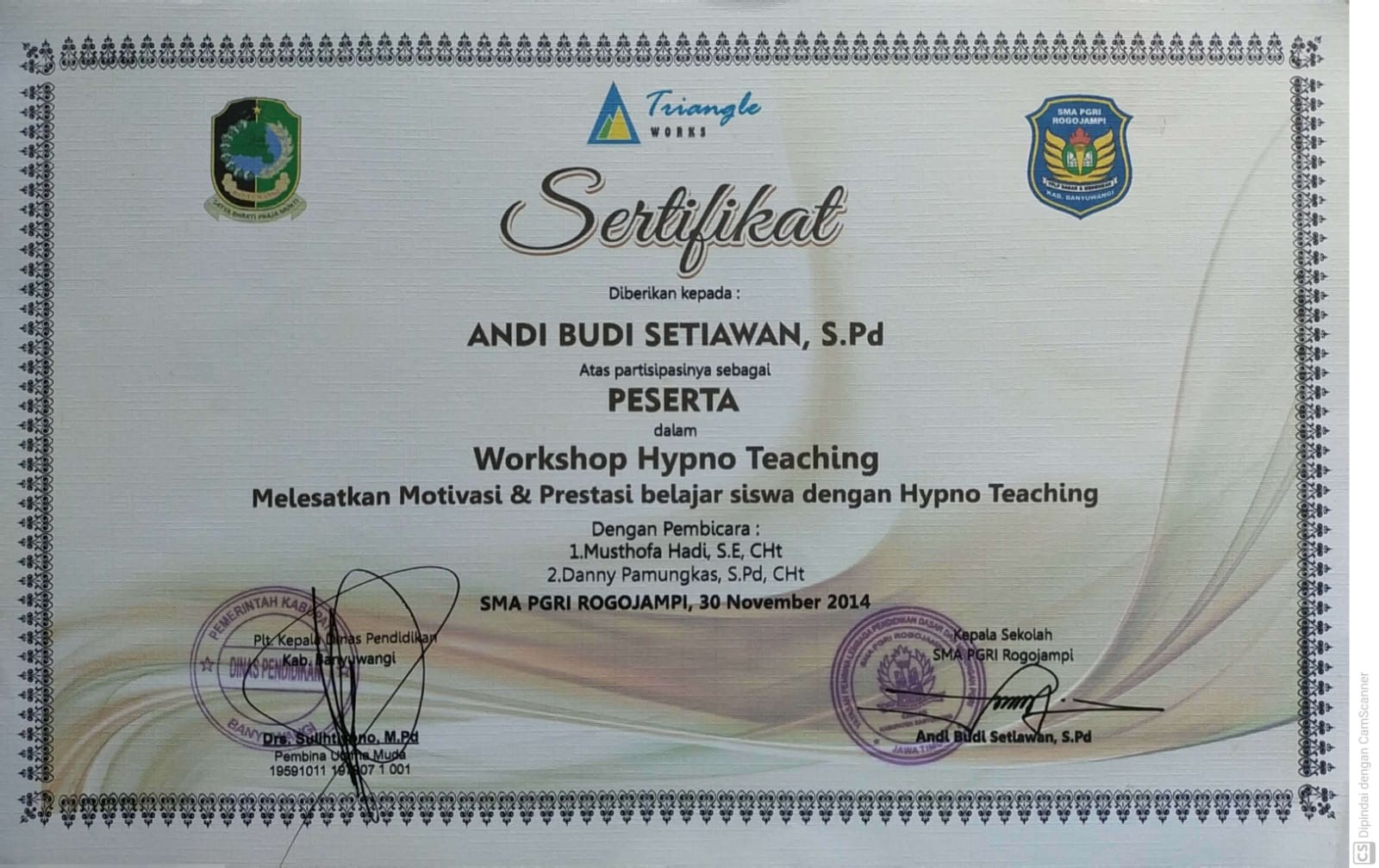 Sertifkat Peserta Workshop “Melesatkan Motivasi & Prestasi Belajar Siswa dengan Hypno Teaching” tahun 2011 diselenggarakan SMA PGRI Rogojampi dengan Dinas Pendidikan Kabupaten Banyuwangi