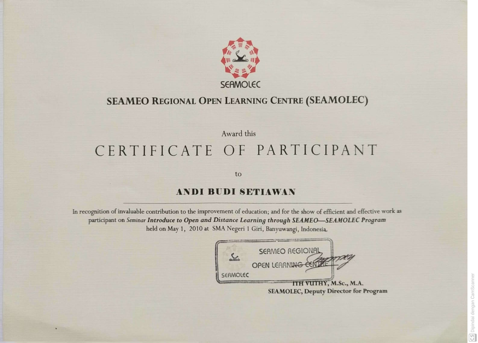 Sertifkat Peserta Seminar “Introduce to Open and Distance Learning through SEAMO – SEAMOLEC” tahun 2010 di SMAN 1 Giri Banyuwangi