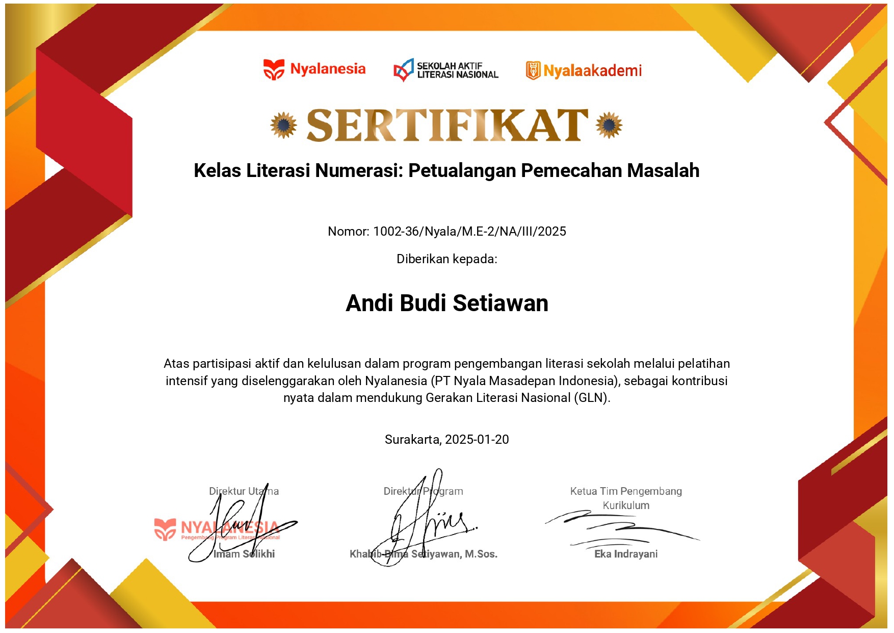 Sertifikat Kelas Literasi Numerasi : Petualangan Pemecahan Masalah tahun 2025 yang diselenggarakan oleh PT Nyala Masa Depan Indonesia (Nyalanesia)