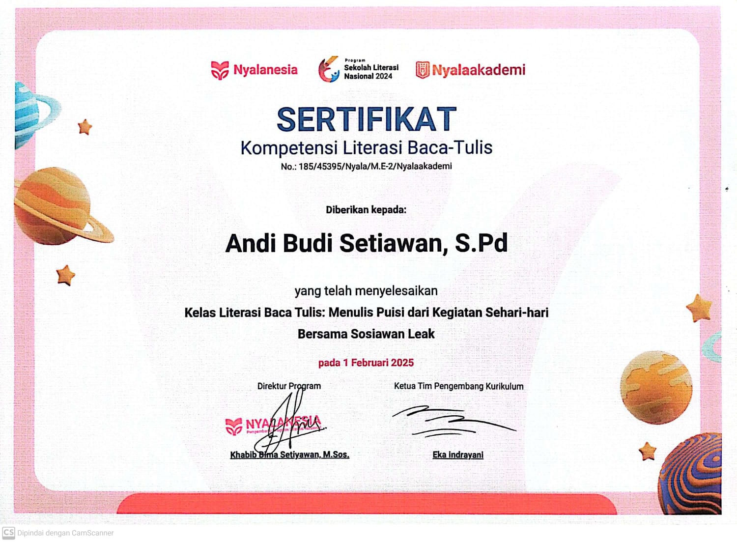 Sertifikat Literasi Baca - Tulis : Menulis Puisi dari Kegiatan Sehari-hari Bersama Sosiawan Leak tahun 2025 yang diselenggarakan PT Nyala Masadepan Indonesia (Nyalanesia)