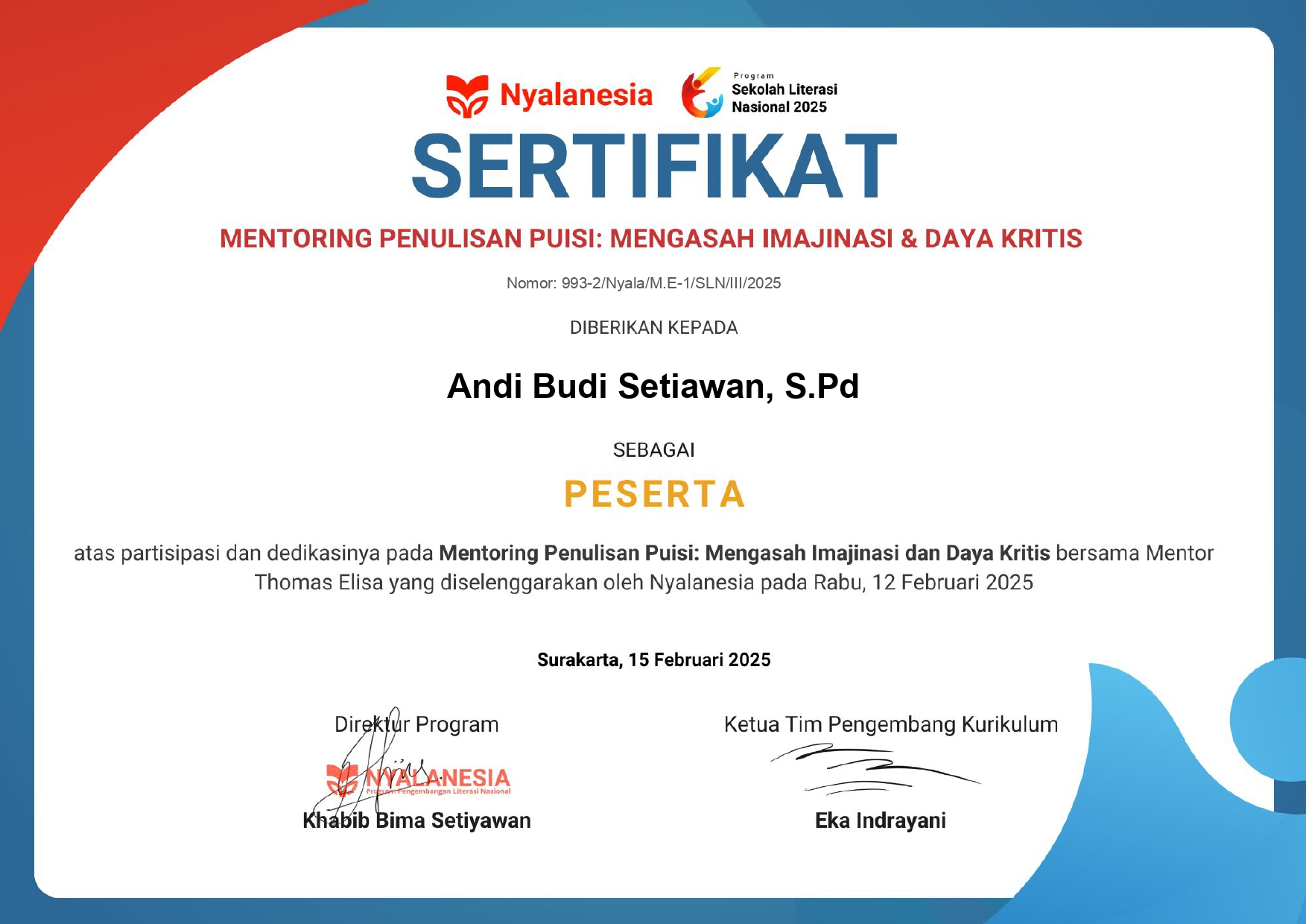 Sertifikat Mentoring Penulisan Puisi “Mengasah Imajinasi dan Daya Kritis Bersama Mentor Thomas Elisa” tahun 2025 yang diselenggarakan oleh Nyalanesia