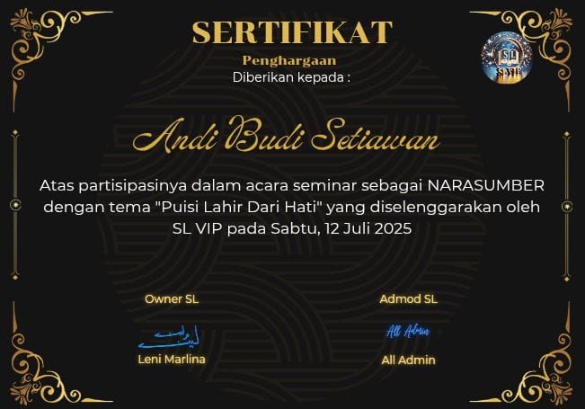 Sertifikat Narasumber Seminar Tema "Puisi Lahir dari Hati" tahun 2025 yang diselenggarakan oleh Seminar Literasi (SL) VIP