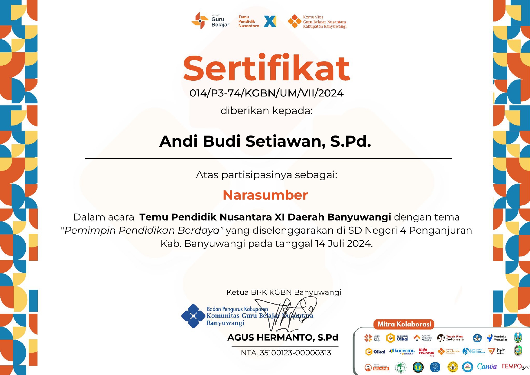 Sertifikat Narasumber Temu Pendidik Nusantara XI Daerah Banyuwangi tem “Pemimpin Pendidikan Berdaya” tahun 2024 yang diselenggarakan Komunitas Guru Belajar Nusantara