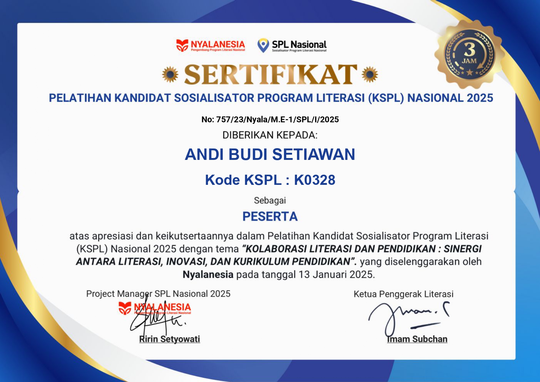 Sertifikat Pelatihan Kandidat Sosialisator Program Literasi Nasional Tema “Kolaborasi Literasi dan Pendidikan : Sinergi Antara Literasi, Inovasi dan Kurikulum Pendidikan” tahun 2025 yang diselenggarakan oleh Nyalanesia