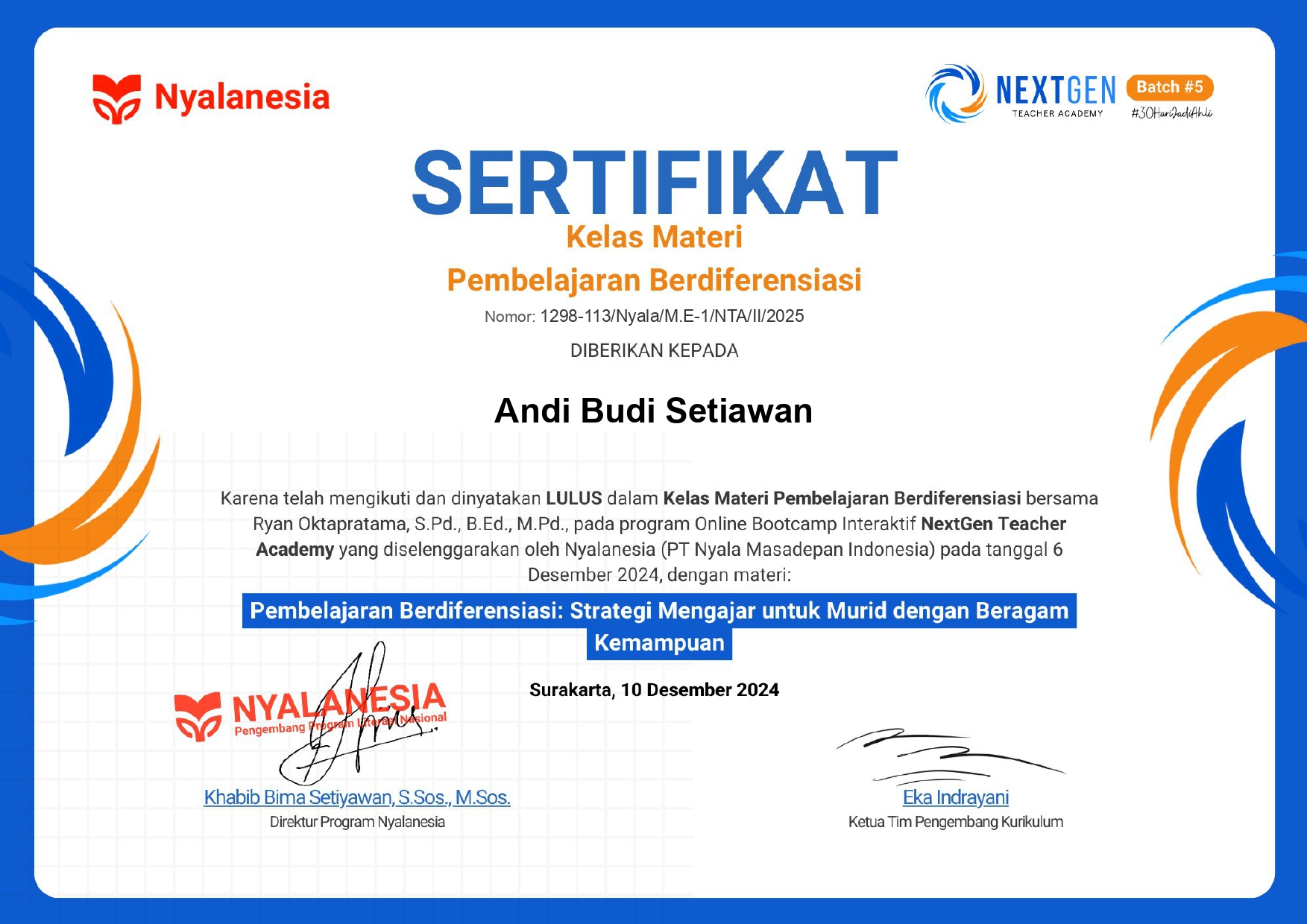 Sertifikat Peserta Kelas Materi Pembelajaran Berdiferensiasi pada Program Online Bootcamp Interaktif NextGen Teacher Academy tahun 2024 yang diselenggarakan PT Nyala Masadepan Indonesia (Nyalanesia)