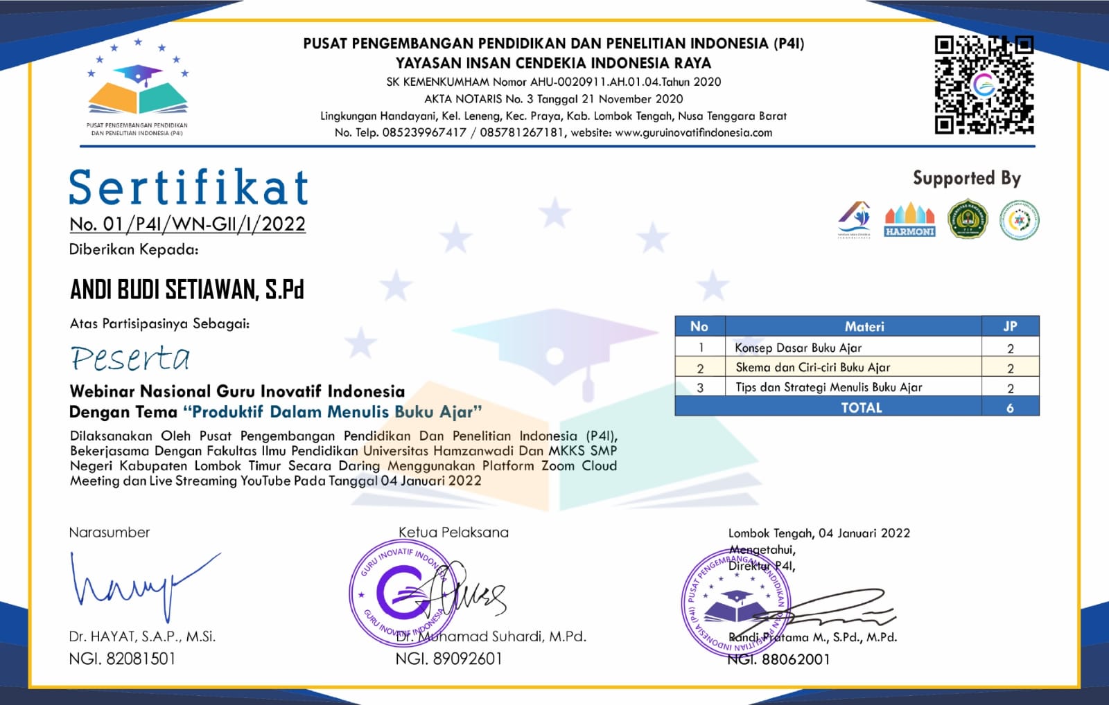 Sertifikat Peserta Webinar Nasional Guru Inovatif Indonesia "Produktif dalam Menulis Buku Ajar" tahun 2022 yang diselenggarakan oleh Pusat Pengembangan Pendidikan dan Penelitian Indonesia (P4I)