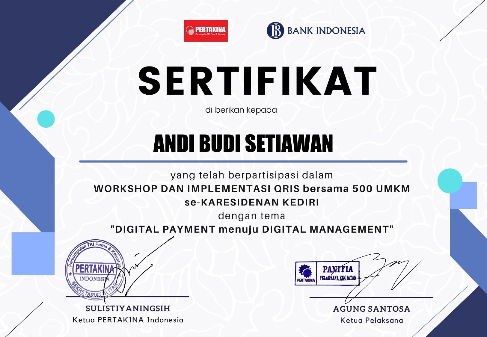 Sertifikat Peserta Workshop Dan Implementasi QRIS "Digital Payment menuju Digital Management" tahun 2022 yang diselenggarakan oleh Pertakina kerjasama dengan Bank Indonesia