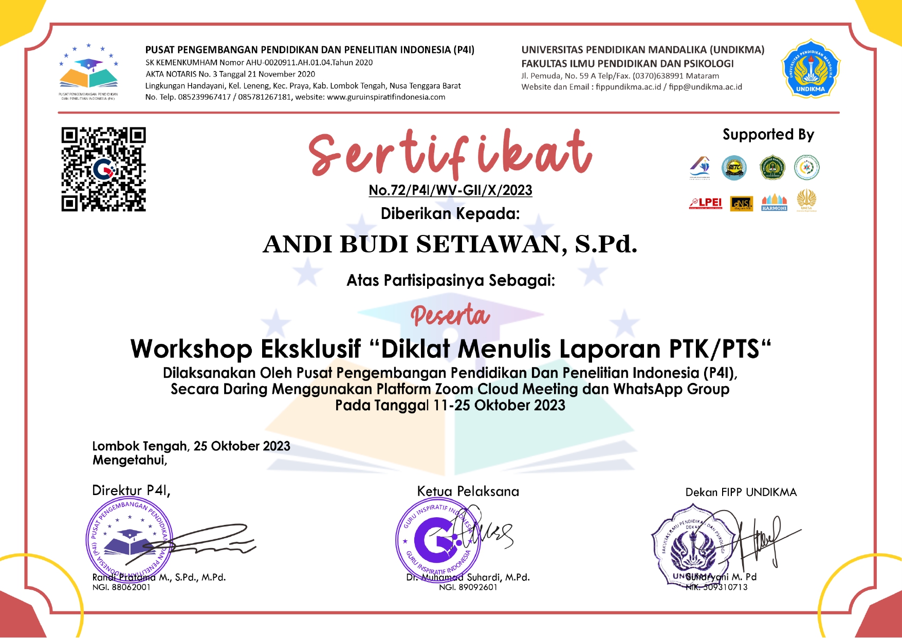 Sertifikat workshop eksklusif Guru Inovatif Indonesia “Diklat Menulis Laporan PTK/PTS” tahun 2023 yang diselenggarakan oleh Pusat Pengembangan Pendidikan dan Penelitian Indonesia (P4I)