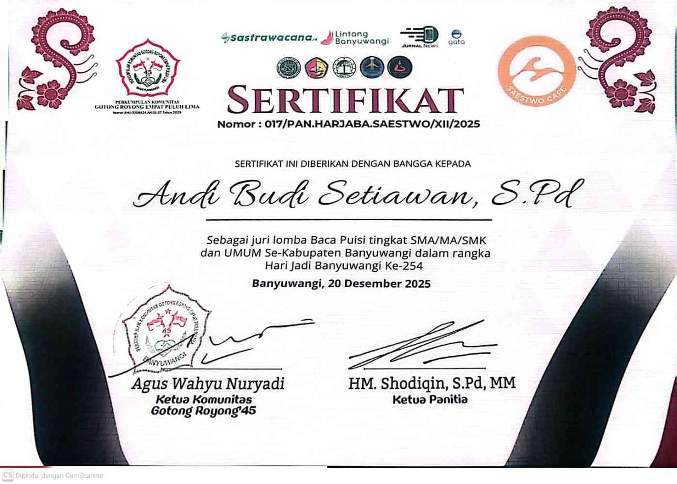 Sertifikat Juri Lomba Puisi Harjaba Ke-254 yang dilaksanakan tanggal 12 Desember 2025 di Café Saestwo Kalipuro Banyuwangi