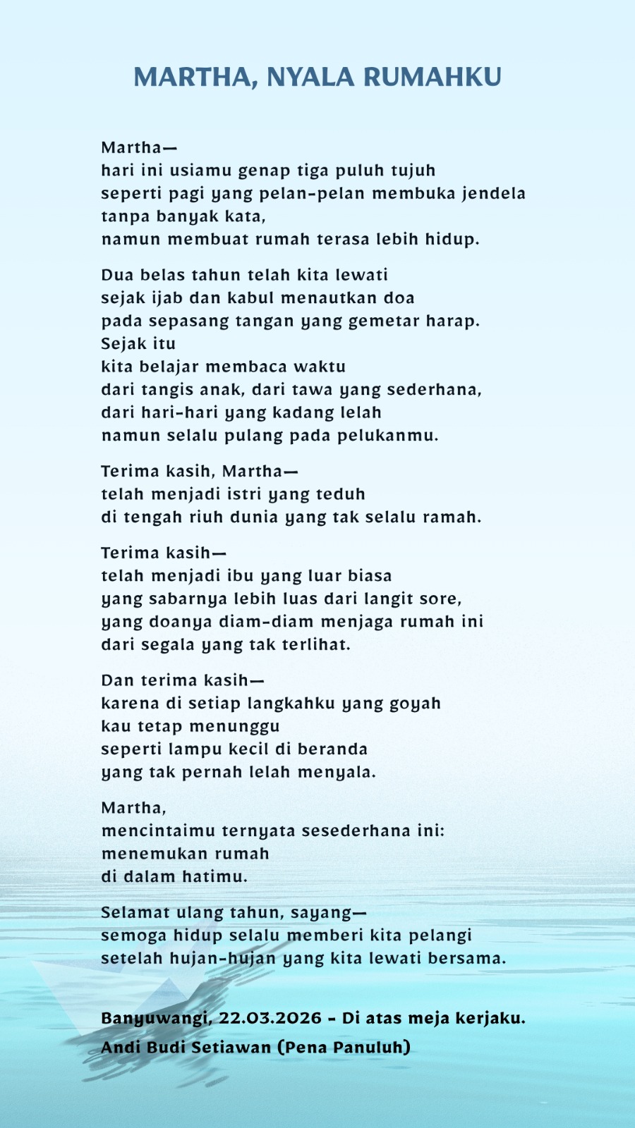 Puisi “Martha, Nyala Rumahku” lahir dari kesadaran akan perjalanan waktu yang tak terasa telah berjalan begitu jauh. Dua belas tahun kehidupan rumah tangga menjadi ruang belajar tentang arti kebersamaan: membaca waktu dari tangis dan tawa anak, memahami lelah yang datang silih berganti, serta menemukan tempat pulang di dalam pelukan yang sama.