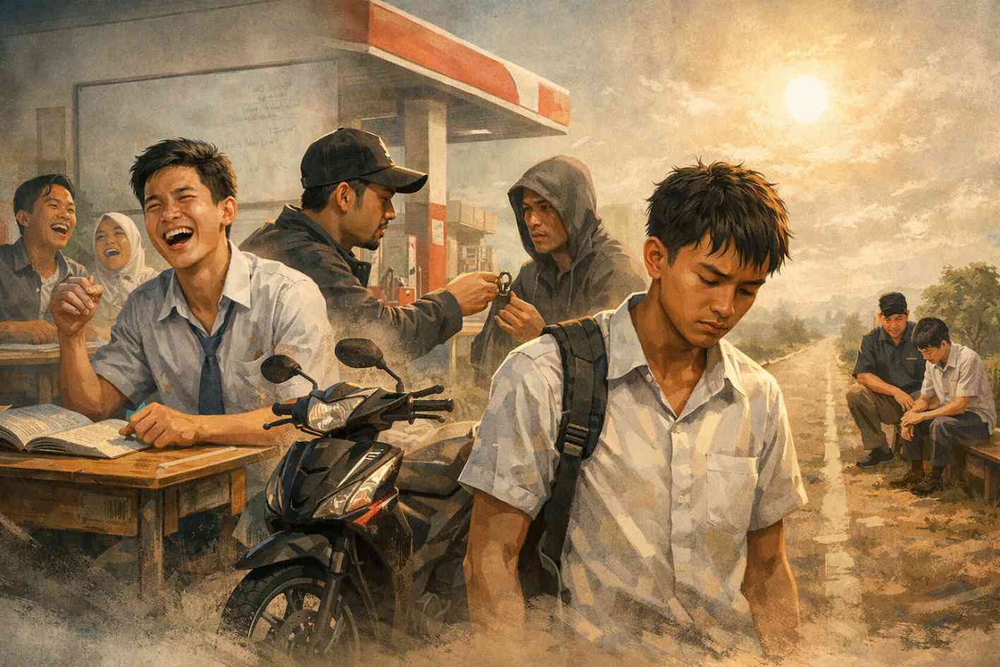 Beberapa hari kemudian guru pembimbing PKL datang ke rumahnya. Mereka mendengarkan ceritanya tanpa banyak nasihat. “Hidup kadang mengambil sesuatu dari kita,” kata gurunya pelan, “tapi bukan berarti ia juga mengambil masa depanmu.” Keesokan paginya Galih kembali berangkat PKL dengan kendaraan pinjaman tetangga. Di kelas, teman-temannya kembali mendengar tawanya. Namun kali ini tawanya berbeda—bukan lagi sekadar hiburan. Itu adalah cara Galih memberi tahu dunia bahwa bahkan setelah kehilangan banyak hal, ia masih memilih untuk tidak kalah.